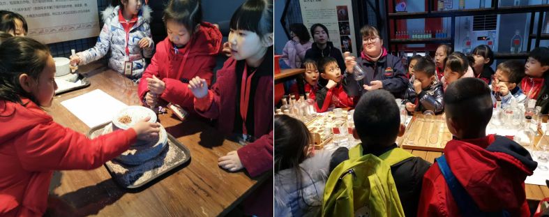 孩子們先后參觀了游客中心、時光酒塔、釀造車間及各類酒庫,盡情體驗了曲樂坊研磨五谷、醉酒屋的形態(tài)各異、以及投壺比賽游戲,深切感受到了酒文化的悠遠魅力。在時光酒塔孩子們知曉了白酒釀造歷史,品位著各不相同的文化特色,并聆聽西安酒廠的發(fā)展歷程;參觀釀造車間時,孩子們了解到工藝釀造,明白高粱制酒的過程;尤其是秦酒宮那別具特色的老酒海,更加開闊了孩子們的眼界。